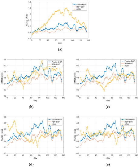We tested 136 days of the 3D SSF data using all mentioned methods and calculated the RMSE. The parameter setting is shown in Table 1. As shown in Figure 14, the performance of RBF + EOF is always better than Fourier + EOF, especially in the range from the 40th to the 90th day. Although the performance of all methods decreased from the 60th to the 90th day, RBF + EOF has more advantages than Fourier + EOF. The performance of HOOI is related to the selection of training data. As shown in Figure 14a–e the training data are the first, 40th, 60th, 75th, and 90th day, respectively, which has the smallest RMSE on the training day. When the training data of HOOI is the first day (training data without eddy) as shown in Figure 14a, RMSE of HOOI is greater than that of other methods in all subsequent days and increases linearly from the first day to the 60th day. That is due to the first day data not containing mesoscale eddies, and HOOI learning no effective basis functions related to mesoscale eddies. When the training data is set as the 40th day (training data with a warm eddy), shown in Figure 14b, the RMSE in the 40th day and adjacent days are smaller than that of other methods, but the performance will be worse than that of RBF + EOF for most of the period, especially in the beginning (from the first day to the 20th day) and end period with cold mesoscale eddy (from the 90th day to the 136th day). When the training data is set as the 90th day (training data with a cold eddy) shown in Figure 14e, the RMSE in the 90th day and adjacent days are smaller than that of other methods, similar to the trend in Figure 14b. The results of other days shown in Figure 14c,d have a similar situation, where RBF + EOF outperforms than HOOI during days without eddy, which performs robustly during the period. On most days, RBF + EOF has the lowest RMSE than HOOI regardless of the training data, while the former uses only one parameter learned from data (the radius).