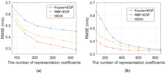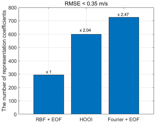 Lastly, the number of parameters required to achieve the same performance (RMSE) can be calculated. As shown in Figure 16, to achieve the goal of RMSE less than 0.35 m/s, RBF + EOF needs 296 coefficients while HOOI needs 600 and Fourier + EOF needs 726, which are 2.04 times and 2.47 times RBF + EOF, respectively. This result is based on a SSF with a mesoscale warm eddy in the center of the reconstruction area, which is state-of-the-art performance for RBF + EOF method. This shows that the proposed RBF + EOF method has good performance in the representation in the horizontal dimension, achieves acceptable RMSE with a lower number of coefficients, and can greatly reduce the degree of uncertainty in the inverse problem.