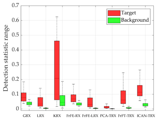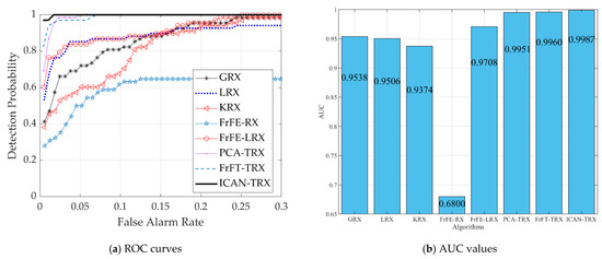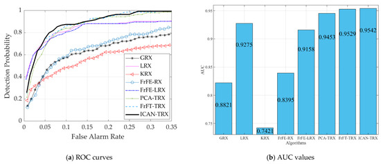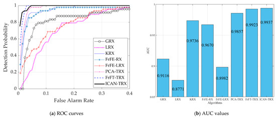 Figure 15 shows Data S and two-dimensional diagrams of AD results for eight test algorithms. As shown in Figure 15, the anomaly targets in Figure 15h–j are more evident than those in the other algorithms. However, some background points in Figure 15h,i are also evident and may be judged as anomaly targets, which causes an increase in the false alarm rate. From Figure 16, we can conclude that the proposed ICAN-TRX has the best ROC curve and the largest AUC value in the eight test algorithms. From Figure 17, we can see that the distance between the target and the background of the ICAN-TRX algorithm is larger than GRX, LRX, KRX, FrFE-RX, FrFE-LRX, and FrFT-TRX but smaller than PCA-TRX. However, the ability of ICAN-TRX to compress the background is better than PCA-TRX.
