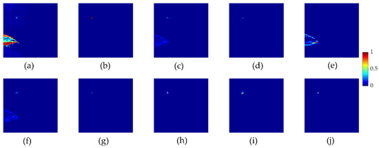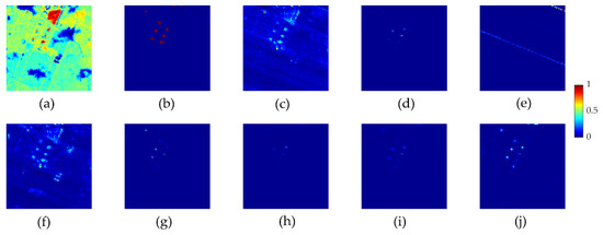 Data S and AD result diagrams: (a) The 100th band of data C. (b) The ground-truth map. (c) GRX. (d) LRX. (e) KRX. (f) FrFE-RX. (g) FrFE-LRX. (h) PCA-TRX. (i) FrFT-TRX. (j) ICAN-TRX.