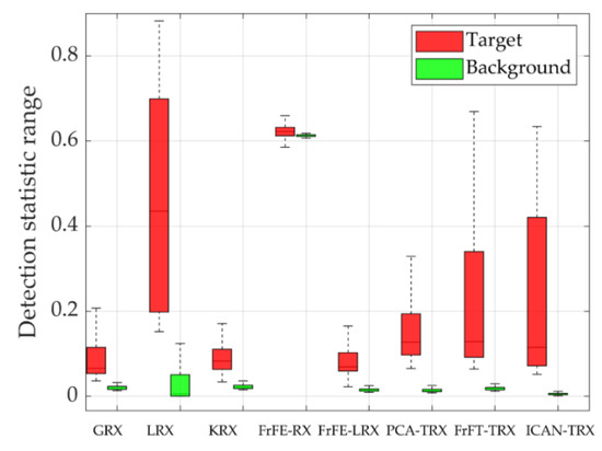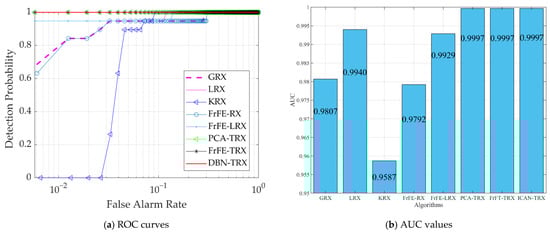Figure 6 shows Data C and two-dimensional diagrams of AD results for eight test algorithms. From Figure 6, we can see that the anomaly targets in Figure 6h–j are more evident than those in the other five comparison algorithms. From Figure 7, it can be seen that the ROC curves and AUC values of FrFE-RX, FrFE-LRX, and FrFT-TRX are the same. Figure 8 shows the separability graphs for data C, and it can be judged that the distance between the target and the background of the ICAN-TRX algorithm is larger than LRX, KRX, and FrFE-LRX but less than GRX, FrFE-RX, PCA-TRX, and FrFT-TRX. However, the ability of ICAN-TRX to compress the background is slightly better than GRX, FrFE-RX, PCA-TRX, and FrFT-TRX.