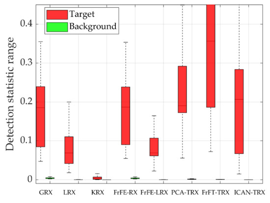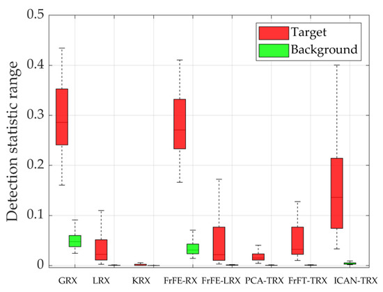 Figure 9 shows data P and two-dimensional diagrams of AD results for eight test algorithms. From Figure 9, we can find that the anomaly targets in Figure 9h–j are more striking than those in the other algorithms. The background in Figure 9j is more unitary than that in Figure 9h,i. It can be judged from Figure 10 that the proposed ICAN-TRX has the best ROC curve and the largest AUC value in the eight test algorithms. Figure 11 shows the separability graphs for data P. It can be judged that the distance between the target and the background of the ICAN-TRX algorithm is larger than GRX, KRX, FrFE-RX, and FrFE-LRX, and ICAN-TRX has the best ability to compress the background among all the test algorithms.