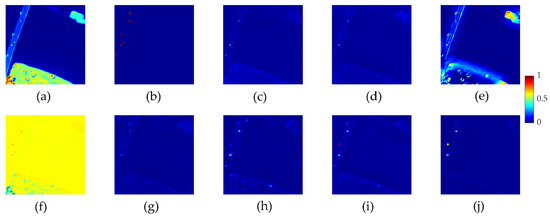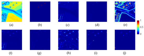 Data P and AD result diagrams: (a) The 100th band of data C. (b) The ground-truth map. (c) GRX. (d) LRX. (e) KRX. (f) FrFE-RX. (g) FrFE-LRX. (h) PCA-TRX. (i) FrFT-TRX. (j) ICAN-TRX.