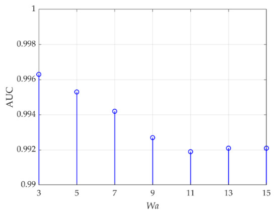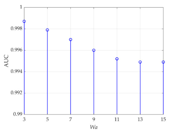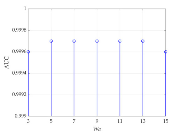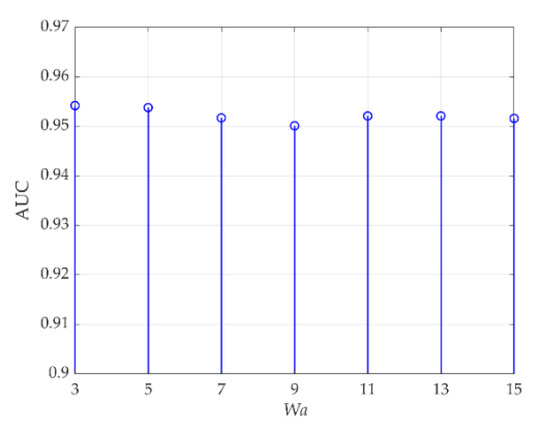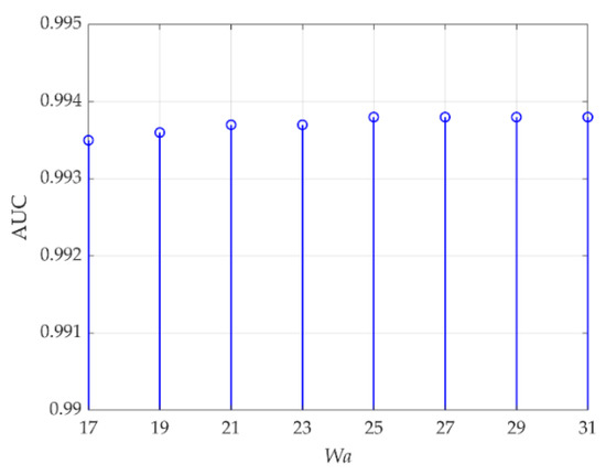 For data S, (ne, be, le) in the DBN reconstruction model are set to (5, 5, 2), respectively. The parameter Wa is first set to 21, and AUC values changing with (Wt, Wb) are listed in Table 8. The optimal value is 0.9937 when (Wt, Wb) are set to (11, 25). Then, (Wt, Wb) is set to (11, 25), and AUC values changing with Wa are shown in Figure 22. When Wa is set to 25, 27, 29, or 31, the optimal AUC value 0.9938 is obtained.