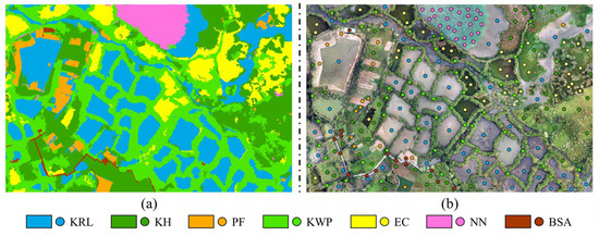 The field investigation was divided into two time periods: 26 to 28 August 2020 and 14 to 21 October 2021. We investigated the vegetation on the ground by setting a quadrat of 1 m × 1 m and used Hi-Target’s V90 GNSS RTK System to record the specific coordinates of the sample points, while the iHand55 Handheld Controller was used to photograph each square from multiple angles and record the vegetation types in the quadrat area. According to the ground investigation, the vegetation types in the aerial photography area were mainly divided into seven types of features: Karst Rivers and Lakes (KRL), Karst Herbages (KH), Paddy Field (PF), Karst Woody Plants (KWP), Eichhornia Crassipes (EC), Nelumbo Nucifera (NN), and Bare Soil and Artifacts (BSA). A total of 240 sample points were obtained, and the specific distribution is shown in Figure 2. In this research, we combined the sample data from the field investigation with the aerial strip images taken by the UAV to visually interpret the DOM using ArcGIS software, mapped the corresponding vectorized data labels, and finally generated the required semantic labels (the image size is 4603 × 3017) by vector conversion raster. The final number of verification samples and pixels is shown in Table 2.