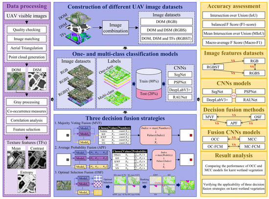 This paper is pioneering in the evaluation of decision fusions for classifying karst wetland vegetation in Huixian Karst National Wetland Park, Guilin, south China, using one-class and multi-class CNN models with high-resolution UAV images. We demonstrated that the use of additional TFs and DSM derived from UAV aerial images improved the classification accuracies of karst wetland vegetation when compared to using only RGB images and achieved an increase in accuracy (IoU) of 20.75% for karst herbs based on one-class classification (OCC) models. We found that the OCC models outperformed multi-class classification (MCC) models for karst wetland vegetation mapping, and the highest accuracy (average value of IoU) difference was up to 10.97%. This study confirmed that fusion classification models (FCMs) have different identification abilities regarding wetland vegetation using different image datasets and CNN algorithms. The RGBS-based and RGBST-based FCMs provide better classification performances compared to the RGB image dataset-based FCMs. For the classification of different CNN algorithms via fusion, PSPNet and DeepLabV3 + achieved the highest average accuracies at the pixel scale (MIoU) and attribute scale (Macro-F1), reaching 74.89% and 94.96%, respectively, which proved that the PSPNet and DeepLabV3 + algorithms have the optimal capability in pixel-based and attribute-based classification for karst wetland vegetation, respectively. The FCMs improved the classification accuracies (IoU) for karst woody plants, Eichhornia crassipes, and Nelumbo nucifera by 0.27–2.55%, 0.55–1.28%, and 0.11–0.12%, respectively, when compared to the single CNN model, which revealed that three fusion strategies improved the classification performance of the CNN models for karst wetland vegetation. One-class FCMs produced a better classification of karst wetland vegetation than multi-class FCMs with an accuracy improvement of 0.59–22.09%.