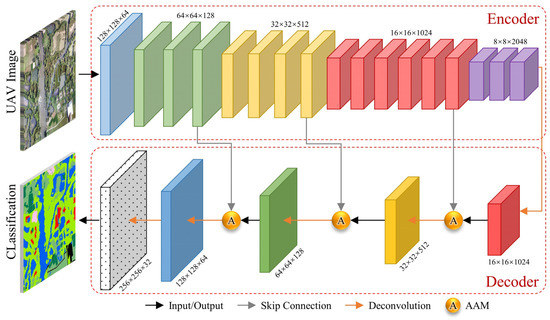 The network structure of RAUNet [44] is shown in Figure 7. The encoder consists of the ResNet-34 and the decoder consists of multiple layers of the Attention Augmentation Module (AAM) and deconvolution to fuse multiple layers of target features. Among them, AAM is used to reconstruct semantic correlations and guide low-level information with high-level semantic information to emphasize key features and filter background information. Furthermore, deconvolution is used in the decoder for upsampling to obtain more refined edge features.