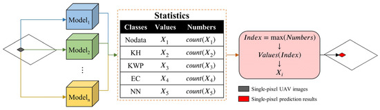 Majority Voting Fusion (MVF) [45] The specific fusion method of this strategy is shown in Equation (1). Taking a single pixel point as an example, we first calculated the values () of the prediction results of all the models used for fusion for that pixel point, up to a total of five types (four vegetation types and one background). After that, we counted the number of occurrences () of different values and used the class corresponding to the value with the highest number of occurrences as the final output result () for that pixel. Finally, we completed the prediction of the whole image in a pixel-by-pixel manner. Taking the OCC model and EC as an example, we fused the models of scenarios 1, 4, 7, and 10 in Table 3 to obtain the OC-FCM based on the RGB image dataset to identify EC. The specific fusion process of the MVF strategy is shown in Figure 8.