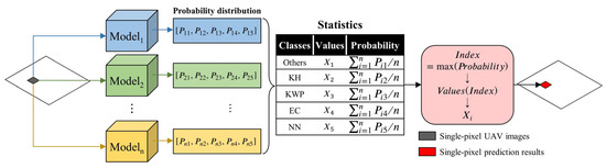 Average Probability Fusion (APF) [45] The specific fusion method of this strategy is shown in Equation (2). Taking a single pixel as an example, firstly, we calculated the probability distributions () of the prediction results of all models used in fusion for that pixel; after that, we added all the probability distributions and averaged them (); then, we selected the class corresponding to the highest probability in the probability distribution as the output result (); finally, we performed the prediction of the whole image in a pixel-by-pixel manner. Taking the OCC model and KH as an example, the models of all scenarios in Group I in Table 3 were fused to obtain the OC-FCM based on the SegNet algorithm to identify KH. The specific fusion process of the APF strategy is shown in Figure 9.