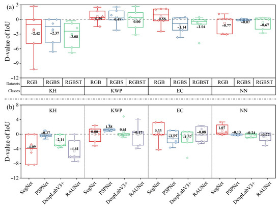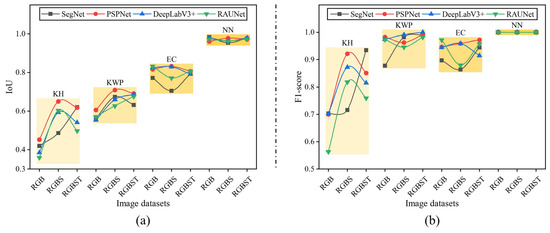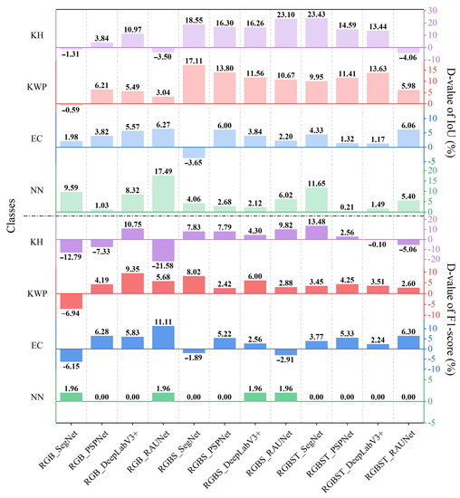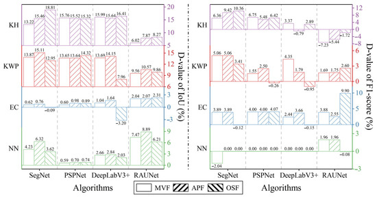 - For KH, the difference values of IoU were all greater than 0, while the difference values of the F1-score were also greater than 0 when using the SegNet and PSPNet algorithms. Among them, the SegNet algorithm combined with the OSF strategy resulted in the difference values of IoU and F1-score reaching the maximum of 18.81% and 10.36%, respectively.