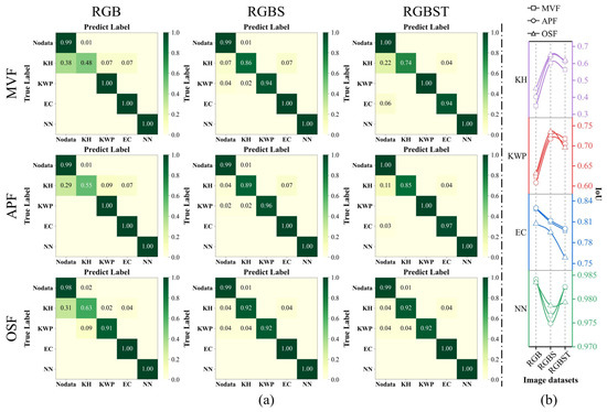 Figure 15 shows the normalized confusion matrix of OC-FCM based on different image datasets at the attribute level (Figure 15a) and compares the differences in the accuracy (IoU) between OC-FCMs at the pixel level (Figure 15b). When using the RGB image dataset, it can be seen by observing the confusion matrix that the variation of recall to KH was larger among the four vegetation types, with KH achieving the highest recall when the OSF strategy was used, which was consistent with the variation trend of the corresponding IoU. When using the RGBS image dataset, it could be seen by comparing the confusion matrix that the recall of KH was improved compared with that when using the RGB image dataset, and the recall of KH remained highest when using the OSF strategy, and this phenomenon was also reflected in the variation of the corresponding IoU. When using the RGBST image dataset, the recall of KH was reduced compared with that when using the RGBS image dataset, yet it was still higher than that when using the RGB image dataset, where OC-FCM based on the OSF strategy still had the best identification ability for KH and the variation trend of the confusion matrix was also consistent with the change in IoU. The above results proved that OC-FCM based on the RGBS image dataset and the OSF strategy had the best performance for KH, both at the pixel and attribute levels. For the other three vegetation types, excluding KH, although the confusion matrix based on the attribute level did not change much, the variation trend of IoU was larger for KWP and EC in the pixel-level evaluation, except for NN. Among them, the variation trend of accuracy (IoU) of KWP was very similar to that of KH (the RGBS image dataset combined with the OSF strategy achieved the highest IoU, that is, the performance at the pixel level was optimal), while the RGB image dataset combined with the APF strategy resulted in the highest IoU of EC, that is, the optimal pixel-level classification performance was achieved.