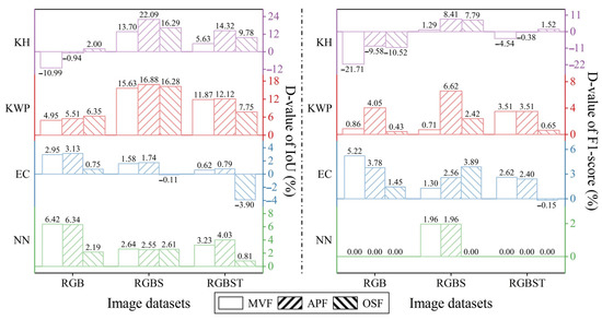 - For KWP, the difference values of IoU and F1-score were both greater than 0 in all cases, and the RGBS image dataset combined with the APF strategy still resulted in the difference values of IoU and F1-score both reaching the maximum of 16.88% and 6.62%, respectively. These results proved that the identification ability of OC-FCM for KWP was better than that of MC-FCM, and the difference between the two reached the maximum when using the RGBS image dataset and the APF strategy.