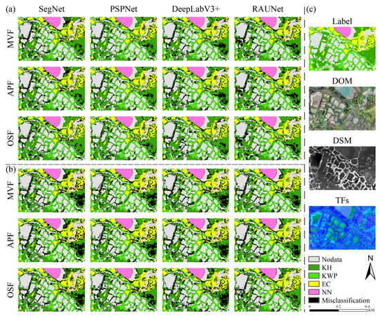 To explore the differences in performance between the FCMs based on different fusion strategies, we plotted the results of the OC-FCM and the MC-FCM based on three fusion strategies (Figure 20), calculated the IoU of each vegetation type (Figure 21b), and plotted the normalized confusion matrix at the attribute level (Figure 21a). For OC-FCM, the misclassification rates using the three fusion strategies were ranked from largest to smallest as follows: MVF > APF > OSF, which could be mostly attributed to the gradual improvement of KH being misclassified (observing the changes in the confusion matrix and IoU). Therefore, among the three types of OC-FCM, the best identification ability for KH was achieved when using the OSF strategy, whose IoU was 7.87% higher than the lowest identification ability (using the MVF strategy). For MC-FCM, similar to OC-FCM in terms of visual effects, the misclassification rate was the lowest when using the OSF strategy, while the difference between the misclassification rates using the MVF and APF strategies was small, which coincided with the variation trend of the corresponding confusion matrix and IoU for each vegetation type. The main reason for this difference was the variation of misclassification of KH, which was consistent with OC-FCM. Therefore, in the three types of the MC-FCM, the best identification ability for KH was also the best when using the OSF strategy, and the difference value of IoU between the best identification ability and the lowest identification ability (using the APF strategy) was 7.64%. Moreover, under identical conditions, the performance of the OC-FCM outperformed the MC-FCM for KH, KWP, and NN, while the performance of the OC-FCM was also better than that of the MC-FCM for EC, excluding the case of using the OSF strategy, and the difference in IoU between the two for each vegetation type ranged from 1.05% to 14.45%.