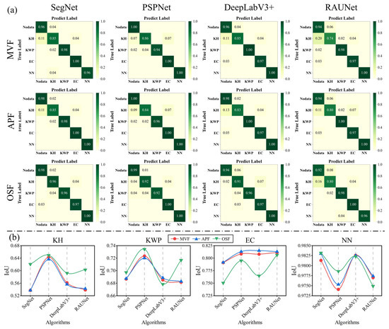 Under the conditions of using identical algorithms, by observing the change in IoU (Figure 18b), it could be seen that for the four algorithms, the absolute difference value of IoU for the identical vegetation when using the MVF and APF strategies was less than 1%. Meanwhile, the IoU for the karst wetland vegetation using the OSF strategy had some differences from that using the MVF and APF strategies. Taking KH and EC as examples, regardless of which algorithm was used, the IoU for KH when using the OSF strategy was higher than that for KH when using the other, which was consistent with the changes in the confusion matrix (Figure 18a), where the PSPNet algorithm combined with the OSF strategy resulted in the IoU of KH reaching the highest value at 0.6494. When using the OSF strategy, the IoU for EC was lower than that for EC using other fusion strategies, where the SegNet algorithm combined with the OSF fusion strategy resulted in the IoU of EC reaching the minimum of 0.7507. The above results proved that the identification ability of the OC-FCM based on the MVF and the APF strategies for karst wetland vegetation was almost equal when the algorithms were identical. Among the three fusion strategies, the OC-FCM based on the OSF strategy had better identification ability for KH, and the OSF strategy combined with the PSPNet algorithm resulted in the OC-FCM achieving the best identification ability for KH at the pixel level. Meanwhile, the OC-FCM based on the OSF strategy had the lowest identification ability for EC among the three fusion strategies, and the OSF strategy combined with the SegNet algorithm resulted in the identification ability of the OC-FCM for EC decreasing to the lowest value.