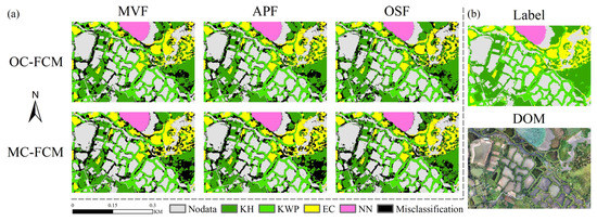 Results of the OC-FCM and MC-FCM based on different fusion strategies for karst wetland vegetation. (a) OC-FCM and MC-FCM, (b) semantic labels and UAV data.