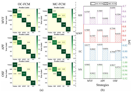 - For KWP, when using the MVF and the APF strategies, the identification ability of OC-FCM was higher than that of MC-FCM, and the difference value of IoU and F1-score reached the maximum when using the SegNet algorithm and the APF strategy (the maximum difference values of IoU and F1-score were 15.11% and 5.06%, respectively).