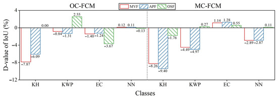 This paper calculated the difference in accuracy (IoU and F1-score) between the results of the OC-FCM and the MC-FCM for each vegetation type under the same conditions (Figure 19) to quantitatively evaluate the difference in performance between the OC-FCM and the MC-FCM for different karst wetland vegetation when using identical algorithms: