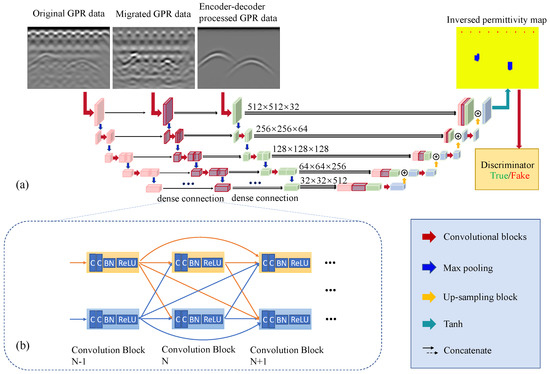 The original, migrated, and encoder–decoder-processed GPR data are used as the inputs of the three encoder paths, respectively. Note that as the migrated and encoder–decoder-processed data are obtained from the original GPR data, the three kinds of GPR data are spatially related, although they are processed with different methods and have different roles. Therefore, we use dense connections between adjacent encoder paths to establish a lateral relationship among the three encoder paths [22], as shown in Figure 1b.