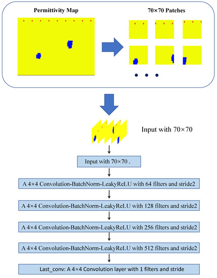In this loss function, the generator aims at minimizing this loss against an adversarial discriminator that tries to maximize it: the generator G is trained to produce the permittivity map that is indistinguishable from the real distribution, and the discriminator D is trained synchronously to discern the generator’s fake. As the generator has already generated blurry results, it is wise to make the discriminator only model high-frequency features. Like the method used in [24], instead of taking the entire image as input, we make the GAN discriminator only classify if the patches in an image are real or fake. This motivates the GAN discriminator to only model high-frequency features. We run this discriminator convolutionally across the image, averaging all responses to provide the ultimate output of D. The structure of the GAN discriminator is shown in Figure 2. The combination of the L1-distance loss and GAN loss is used as the loss function of our inversion network: