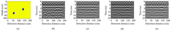 In this research, we used Stolt migration [27] to intensify the hyperbolas in the GPR B-scan images. Stolt migration is a wave-equation-migration-based algorithm that uses the wave equation to back-propagate the recorded wave. Stolt migration takes the advantage of Kirchhoff’s migration and runs faster by employing the fast Fourier transform. When performing the Stolt migration process, it is important to select a proper migration velocity. If the selected velocity is lower or higher than the true velocity, it may cause “under-migrated” or “over-migrated” GPR data. Figure 4 demonstrates the effect of migration with different velocities. Figure 4a,b depict the permittivity map and the synthetic GPR image before migration, and Figure 4c–e are the migrated GPR images using the correct velocity value (0.096 m/ns), a lower velocity value (0.080 m/ns), and a higher velocity value (0.140 m/ns), respectively. Figure 4d,e are typical “under-migrated” and “over-migrated” GPR images. When the migration velocity is inappropriate, the focus effect of the migration method is reduced greatly. In this work, we determined the migration velocity using the minimum entropy technique [28,29]. Suppose a migrated GPR B-scan image is expressed as a two-dimensional matrix X.