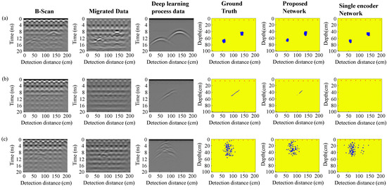 Inversion results on the synthetic dataset: (a) synthetic data with void defects; (b) synthetic data with cracks; (c) synthetic data with untightness. The first three columns depict the original B-scan, migrated, and deep-learning-processed GPR images, respectively, as the input data. The fourth column shows the ground truth permittivity maps. The last two columns depict the inversion results of the proposed method and the single encoder network.