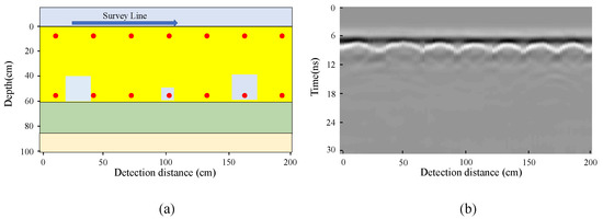 Laboratory model for real-world GPR data acquisition: (a) cross-section of the model and (b) collected raw GPR data.