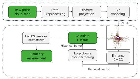 This section introduces our solution in four major stages: construction of multi-channel descriptors, selection of loop candidates, DTORB feature extraction, and similarity measurement. The concrete pipeline of the procedure is shown in Figure 2. To start with, the point clouds are projected and encoded into multi-channel descriptors after undergoing data preprocessing. Next, possible loop candidates are selected by the descriptors. The first step is to calculate the translation-invariant retrieval vector and linear weighted distance for CMCD to get the loop candidate set of the current point clouds; the second step is to extract rotation-invariant DTORB features for the descriptors; the third step is to calculate the Hamming distance between matched rotation-invariant features as the similarity score and decide whether the two-frame point clouds are a loop-closing pair.