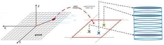 The value assigned to the second channel is the height information coding result for the points in . We encoded the height values into octal codes and then converted them into decimal numbers as the final for all points within a subregion by referring to IRSI []. The specific way of height coding is described as below: For the set of point clouds within each subregion, firstly, sort them by height. Then, linearly discretize them into eight bins (not each bin has points, and the value of the bins with points is 1, whereas the value of those without is 0) so as to obtain 8-bit binary codes for the height information. Finally, convert them into decimal numbers, as shown in Figure 3.
