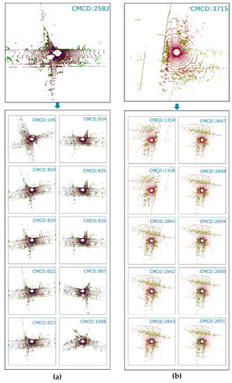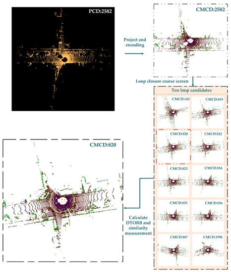 The retrieval vector of CMCD is then by Formula (5) and stored in the KD tree. The ten most similar historical point clouds, of which the IDs are in a candidate set of loop-closing pairs, to the current point clouds are retrieved by Formula (9). The results of the selection of loop candidates are shown in Figure 4. We project and encode the point cloud at frame 2582 of KITTI-05 to obtain the descriptor CMCD. Then we calculate the retrieval vector for CMCD according to the formula and quickly retrieve the ten most similar loop candidates from the KD tree according to the linear combination distance. The frame IDs of the ten most similar loop candidates are 145, 819, 820, 822, 823, 834, 835, 836, 887, and 1998, respectively.