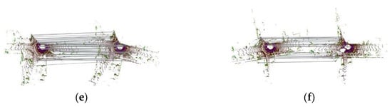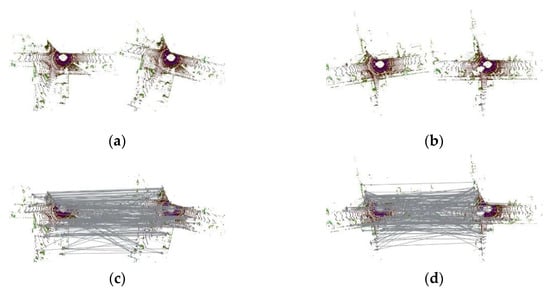 where is the index of the nearest candidate point cloud retrieved by the KD tree; is the given acceptance threshold, typically taken as 0.4–0.56; is the index of the most similar point cloud among the candidate point clouds to the current ones. These two-frame point clouds are a loop-closing pair. Feature matching is visualized in Figure 5: