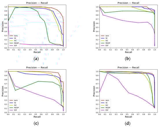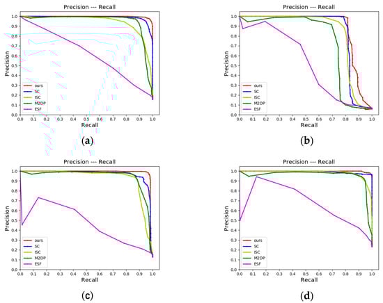 To obtain the actual precision rate and recall rate, the ground truth pose distance between the query and the matched frame is set as the criterion for loop detection. If the distance is smaller than 4 m, then the loop is considered true positive. To avoid matching with adjacent point clouds, no similarity judgment is made for the previous 50 frames and the next 50 frames to the current frame. Each frame of point clouds is projected into CMCD, the DTORB features are calculated after the rough screening by the KD tree, and the similarity between point clouds is measured according to the distance between features. Next, our parameters are optimized over the KITTI odometry sequences, and the distance threshold is continuously improved to accurately screen loop frames. In this paper, the parameters of CMCD are set as follows: the size of CMCD = 160 × 160, range of point cloud selection = 120 m × 120 m, dimension of the retrieval vector stored in the KD tree = 120, number of the nearest neighbors retrieved by the KD tree = 10. In SC, the number of the nearest neighbors retrieved by the KD tree is set as 10, the number of bins as 20 × 60, and the maximum radius as 80 m. In ISC, the number of bins is set as 20 × 90, and the maximum radius is set as 60 m. There is no parameter to set in ESF. In M2DP, the number of bins per 2D plane is set as 8 × 16, and the number of 2D planes to use is set as 4 × 16. These parameters are set according to the open-source code and the paper.