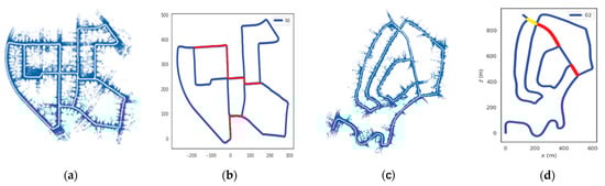 In this experiment, the LCD module is added into the LeGO-LOAM [,,] framework, using ICP [] to match the current point clouds with historical ones of loop closure upon detecting loop closure, and a constraint factor is built. Afterward, the LiDAR odometry factor obtained at the frontend of LeGO-LOAM and the constraint factor obtained in our LCD scheme are both added into GTSAM [] for mapping after backend optimization. The estimated trajectory on KITTI odometry sequences and JLU datasets after adding our own loop constraint into Lego-LOAM is shown in Figure 8. In Figure 8, the detected obverse loop closures are marked with red lines, and the detected reverse loop closure are marked with yellow lines. As shown in Figure 8a,b, the loop closures detected on the KITTI-00 sequence are completely closed in the map; the estimated trajectories show no intersection, overlap, or disconnection. As shown in Figure 8g,h, loop closures can still be accurately detected on the jlu00 sequence, thereby avoiding map drift. This suggests our method can accurately detect loop closure at different locations, avoid drift due to cumulative error, and improve the performance of mapping results. At the closed-loop position, the current trajectory coincides with the historical trajectory without ghosting and drift problems. In addition, wrong loop closure information is not registered in the estimated trajectory, so the accuracy of mapping is high. In addition, we show the mapping of jlu02 and jlu03 in detail. As can be seen from Figure 9, the constructed maps in jlu02 and jlu03 have no drift and ghost, where the overall layout of buildings and the extension direction of roads correspond to the scenes in Figure 9a,e. Figure 9b,c,f,g show the global mapping and local LCD results, respectively. Figure 9c,g is a magnification of the positions circled in Figure 9b,f, all of which are located in the closed part of the loop marked in red in Figure 9d,h. Therefore, the SLAM algorithm with CMCD as an LCD module can accurately detect loop closure in real scenes without errors.