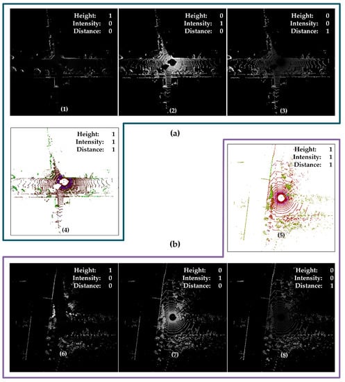 Illustration of CMCD and simple bird’s eye view projection: (a) The CMCD projection of frame 2582 on KITTI-05 (as shown in (4)) and the corresponding single-channel projection of height, intensity, and distance (as shown in (1), (2) and (3), respectively); (b) The CMCD projection of frame 3715 of jlu02 (as shown in (5)) and the corresponding single-channel projection of height, intensity, and distance (as shown in (6), (7) and (8), respectively). In the legend, “Height: 1; Intensity: 0; Distance: 0,” indicates that the image is projected according to the height information.