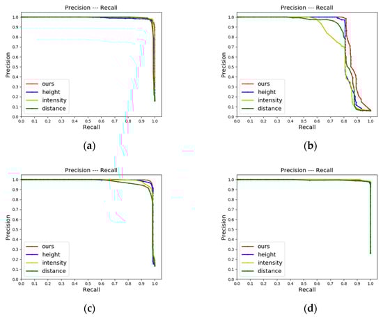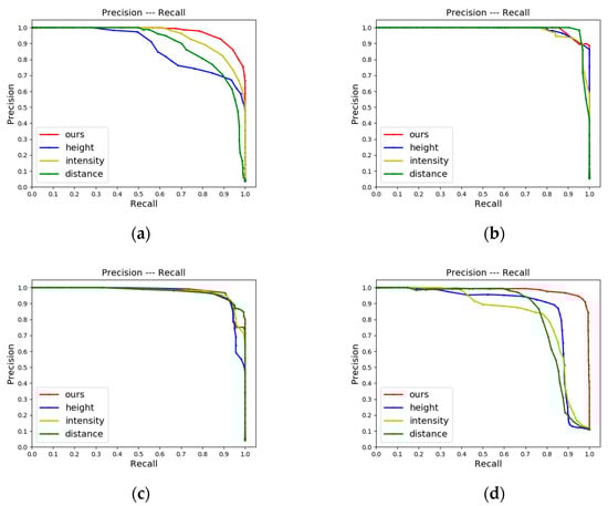P-R curves of CMCD, single-channel projection of height, intensity, and distance on JLU datasets: (a) P-R curve of jlu00; (b) P-R curve of jlu01; (c) P-R curve of jlu02; (d) P-R curve of jlu03.