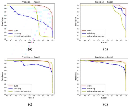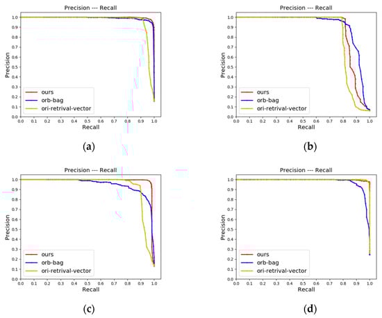 where is the precision rate; is the recall rate; is the harmonic average of and of the model, which gives simultaneous consideration to the model’s precision rate and recall rate. Distinct loop acceptance thresholds are set within the interval [0, 1] in the experiments, and the P-R curves of the algorithms are plotted to evaluate the LCD performance.