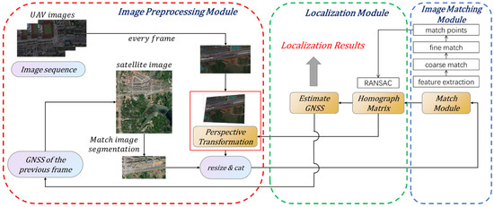 The whole system can be divided into three parts: The image preprocessing module is to improve the precision and efficiency of the matching method; The image matching module is the proposed image matching method; The localization module estimates the position of UAVs through the results of image matching. Since the matching results directly affect the localization precision, the image-matching module is the key module of the whole system and the focus of our research. The following sections explain the three modules in detail.