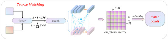 The performance of the coarse matching module has a huge impact on the result, so two different matching methods are designed in the coarse matching stage. According to the research of [34,35,36], the Transformer module can effectively improve robustness and precision. The Transformer-based matching method uses the self-attention and cross-attention mechanisms to encode the features. In addition, the cost matrix is constructed by correlating the encoded features, which is used to establish the pixel-level matching results. Specifically, the SoftMax function is used to convert the cost matrix into a probability distribution matrix. The elements in the probability distribution matrix represent the matching probability of different pixels. Finally, the matching point pairs with the highest confidence is output. The cost matrix and probability distribution matrix can be calculated as Equations (1) and (2):