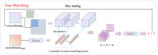 After the coarse matching is established, the matching point pairs obtained by the coarse matching are refined to the original image resolution by using the fine matching module. The fine-matching module framework is shown in Figure 5. The input of the module is a high-resolution feature map and coarse matching coordinates. Firstly, all the coarse matching points are located on the high-resolution feature map, and then a local window of size 5 × 5 is constructed on one of the feature maps with the matching points as the center. Then, the feature association is implemented locally through Equations (1) and (2), and the confidence matrix of size 5 × 5 is output. After the confidence matrix is constructed, the fine-matching module uses the DSNT (Differentiable Spatial to Numerical) layer [50] to refine the coordinates. The DSNT layer is a differentiable numerical variation layer, which is consistent with the training of a convolutional neural network. DSNT layer only needs to input the confidence matrix. Through the preset adjustment matrix and cross convolution, the DSNT layer outputs the pixel coordinate fine-tuning, ranging from (−1, −1) to (1, 1). The fine matching module uses the DSNT layer to adjust the coarse matching coordinates, which can achieve sub-pixel matching precision.