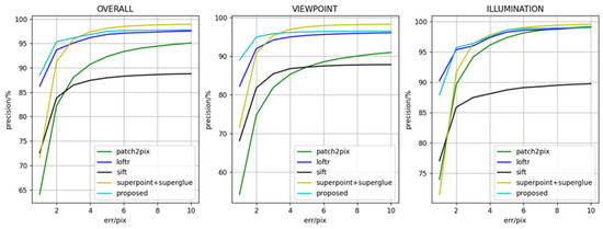 The precision result of matching point pairs is shown in Figure 6. In the figure, the horizontal axis represents the error of matching points relative to the true value, which ranges from 1 to 10 pixels. The vertical axis represents the proportion of matching points whose error is within the threshold. From the curve results of the graph, the matching point precision of the proposed method is ahead of the current typical matching methods. The proposed method is slightly inferior to the LoFTR method on illumination variation data. In addition, it should be noted that the precision in 4–10 pixels of the SuperGlue method is higher than that of the proposed algorithm, which is caused by the different matching frameworks. The proposed method is detector-free, which may lead to mismatched points. By contrast, the SuperGlue method is based on SuperPoint feature points. This method only matches the regions with better texture, which reduces false matching. However, as described in Section 2.3, the detector-based matching methods can’t extract repeatable features in sparse texture areas, and the robustness is not enough.