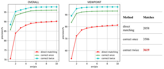 It can be clearly found from the figure that the perspective transformation module effectively improves the precision of matching points. A single perspective transformation module has greatly improved the performance of the method. The precision of matching points for viewpoints data is improved by 13%, and the number of matching points is increased by 1500 on average. Due to the improvement of matching point accuracy, homography matrix estimation has better results. As shown in Table 2, the homography matrix precision with different errors is improved by 13% on average. Moreover, there is still improvement after applying the perspective transformation module twice, especially for the estimated homography matrix; the precision is improved by nearly 8%. The perspective transformation module significantly improves the algorithm, which is mainly caused by two aspects: Firstly, because the Euclidean distance is a nonlinear similarity measure method, the proposed method performs poorly on the viewpoints data, and the precision is a bit low. Secondly, the matching performance of the original model is very good for the illumination data. So, the perspective transformation module can effectively utilize the advantages of the proposed method and improve the matching precision.