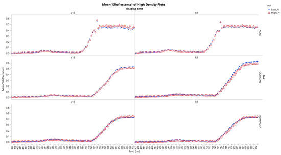 Additionally, the impact of N treatment (high vs. low N) at either timepoint on the spectral response was examined. A change in the reflectance for the different treatment effects would suggest that the remote imaging is sensing the treatment effects on the plants, although it is unknown whether this is specifically due to structural or biochemical differences. The difference in spectral response between the high and low N treatments in Figure 1 (at either V16 or R1) was present but small, likely due to the early season acquisition of the images. In general, N stress increases over the growing season when maize plant uptake capacity exceeds available soil N from fertilizer and net N mineralization from organic N in the root zones [46]. Pre-plant or V3 soil tests to a 30 cm depth showed moderate nitrate-N levels at Rominger and ACRE (9 and 14 mg kg−1, respectively), but high nitrate-N at Gorman (24 mg kg−1 at pre-plant) in the low N plots indicated above-adequate early season availability of mineralized soil N. In the NIR region, the high N treatment had slightly greater reflectance levels at both ACRE and Rominger than the low N treatment, as expected for healthier vegetation not undergoing N stress [47,48]. However, the opposite NIR response was evident at Gorman at both V16 and R1 (low N plants with higher NIR reflectance than high N plants). High N treatments at Gorman had higher average total plant N content (TNC) throughout the growing season than the low N treatments. However, the difference in TNC between the high and low N treatment varied substantially through the season; a difference of 51 kgN ha−1 at V12 decreased to 2 kgN ha−1 by R1 before increasing again by R6 (29 kgN ha−1). Hence, the spectral response at Gorman also corresponded to in-field plant sampling. In summary, the measured spectral responses paralleled the observed and expected field-based results.