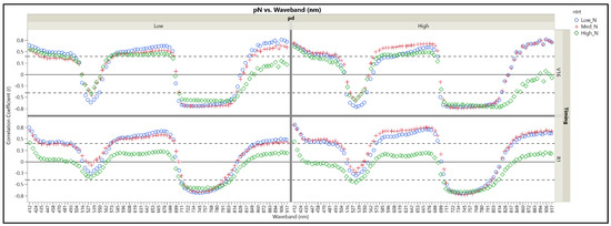 Pearson product-moment correlations (r) for N concentration (pN) at R6 by waveband (nm) from images at V16 (upper block) or R1 (lower block) for low and high planting density (pd) colored by N treatment (Low N = blue circle, Med N = red plus, High N = green diamond). Black lines are for reference only: solid line is at r = 0 and dashed lines at r = |0.4|.
