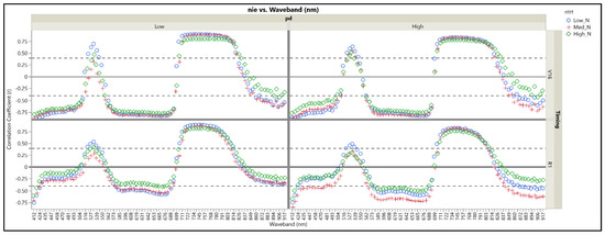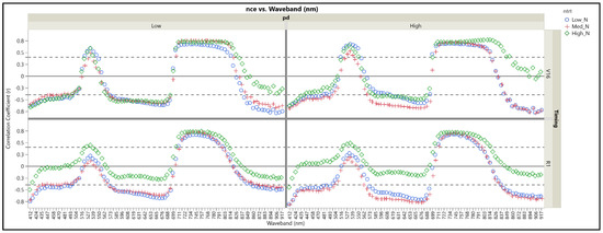 The correlation between reflectance at V16 and NCE was similar across N treatments, except in the upper NIR region at which the absolute value of correlations increased (i.e., more negative) at lower N rates (Figure 3). By R1, there were clear differences in the correlations between N treatments in the blue, green, red, and upper NIR regions. The changes in the spectral range of 500–700 nm are possibly due to the effects of photosynthetic pigments, likely in response to N treatment. High correlation levels have been documented between leaf reflectance and chlorophyll a and b, carotenoids, and leaf N concentration and content in that waveband region [48]. Under high N treatment a stronger positive relationship between reflectance and NCE in the green region was sustained from V16 to R1, while in the red and blue regions this relationship weakened considerably. In general, our results suggest that pigment loss was already occurring at R1 and would impact future NCE outcomes. The changes in the correlations between low N and high N treatments over time suggest that, under high N, chlorophyll may have a stronger, more direct relationship to end-season NCE than other pigments since it absorbs poorly in the green region. Conversely, under low N conditions, anthocyanins and carotenoids, which reflect light in blue and red regions, may have a more influence on final NCE. The similarity of the regions with strong (though inverse) correlations between pN and NCE confirmed our hypothesis that end-season NCE would show responses similar to that seen for pN since total plant N content (TNC) is an NCE component.