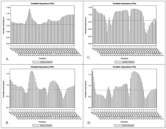 Plots of Variable Importance for Projection (VIP) values for NCE at V16 (A), NCE at R1 (B), NIE at V16 (C) and NIE at R1 (D). Predictors for each model are shown on the x axis. Line is at reference value of 0.8; values less than 0.8 are deemed not important as per [44].