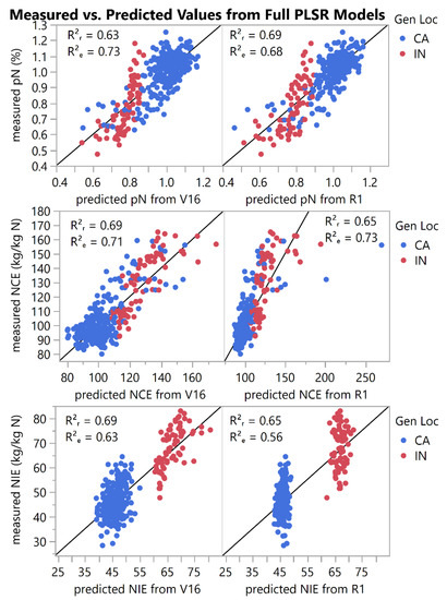 Examination of the PLSR models for NIE indicated that both V16 and R1 models accounted for less than 65% of the variability in NIE (Figure 6), yet the model statistics shown in Table 1 were not excessive (CV < 15%) or grossly different (RMSE; SEP). The plots of measured vs. predicted values for the NIE models in Figure 6 revealed very little association between these values as well as extreme differences in the predictions between the CA and IN locations. A partial explanation for the separation between locations may be the large proportion of non-overlapping NIE values at the two locations evident by the fact that the maximum NIE value in CA (excluding outliers; 59.3 kg kg−1N) is below the interquartile range in IN (61.8 to 74.4 kg kg−1N). Previous research with hyperspectral PLSR models for wheat biomass prediction [61] also underscored the negative effect of non-overlapping distributions on PLSR model predictions.