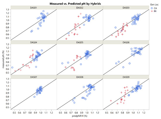 The NCE predictions were more highly correlated to the measured values when generated by the full V16 PLSR model than the R1 model (Table 2) indicating the V16 model hybrid predictions were more similar to the measured outcomes. All hybrids, except DAS07, had similar or stronger correlations based on imaging at the earlier time point. The difference in the correlations between the NCE V16 and R1 models was much greater than the difference between the pN models. Only three of the nine hybrids had weak hybrid correlations (<0.80) based on the V16 model. In contrast, the R1 NCE model provided poorer predictions for multiple hybrids. The hybrids with lower correlations with either one of the models tended to have inconsistent post-silking TNC or TDM gain across the locations and N rates. This suggests the poorer predictions may likely be due to a genotype effect instead of an image timing effect. Interestingly, predictions from the V16 model for DAS07 were less accurate than those from the R1 model while the opposite was true for DAS04 and DAS05. However, both NCE models underestimated the predictions for DAS01 and DAS08, specifically for the higher in situ NCE values such as those greater than 120 kg kg−1N (data not shown).
