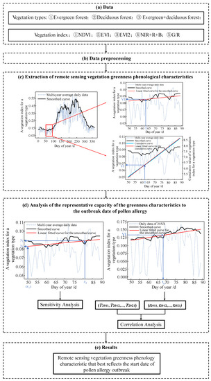 For a certain vegetation type, the satellite-derived phenological characteristic of vegetation greenness is defined as a combination of a certain vegetation index value and its corresponding date. The technical process for the extraction of the greenness characteristics before pollen allergy outbreak is shown in Figure 2, which includes the following three main steps: (1) The preprocessing of remote sensing vegetation index time-series data; (2) the extraction of satellite-derived phenological characteristics of vegetation greenness; and (3) the analysis of the representative capacity of the greenness characteristics to the outbreak date of pollen allergy.