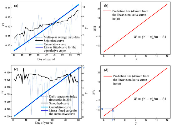 An example shows how the prediction model of pollen allergy works for each year. (a) The preprocess of vegetation index data during 2011–2021; (b) the final cumulative linear fit prediction model; (c) the preprocess of vegetation index data in 2021 from the 1st day to the 50th day; and (d) the process of predicting pollen allergy in 2021. Y is the vegetation index value; W is the predicted number of days to the outbreak date of spring pollen allergy in Beijing (a negative value indicates that the outbreak date has not yet arrived, and a positive value indicates that the outbreak date has passed); y is the smoothed cumulative vegetation index value on the 50th day in 2021; and w is the predicted number of days to the outbreak date of spring pollen allergy in Beijing in 2021. Note the difference between the model building with the multi-year average vegetation index time series in (a) and the model prediction with the daily vegetation index time series in a certain year in (c).