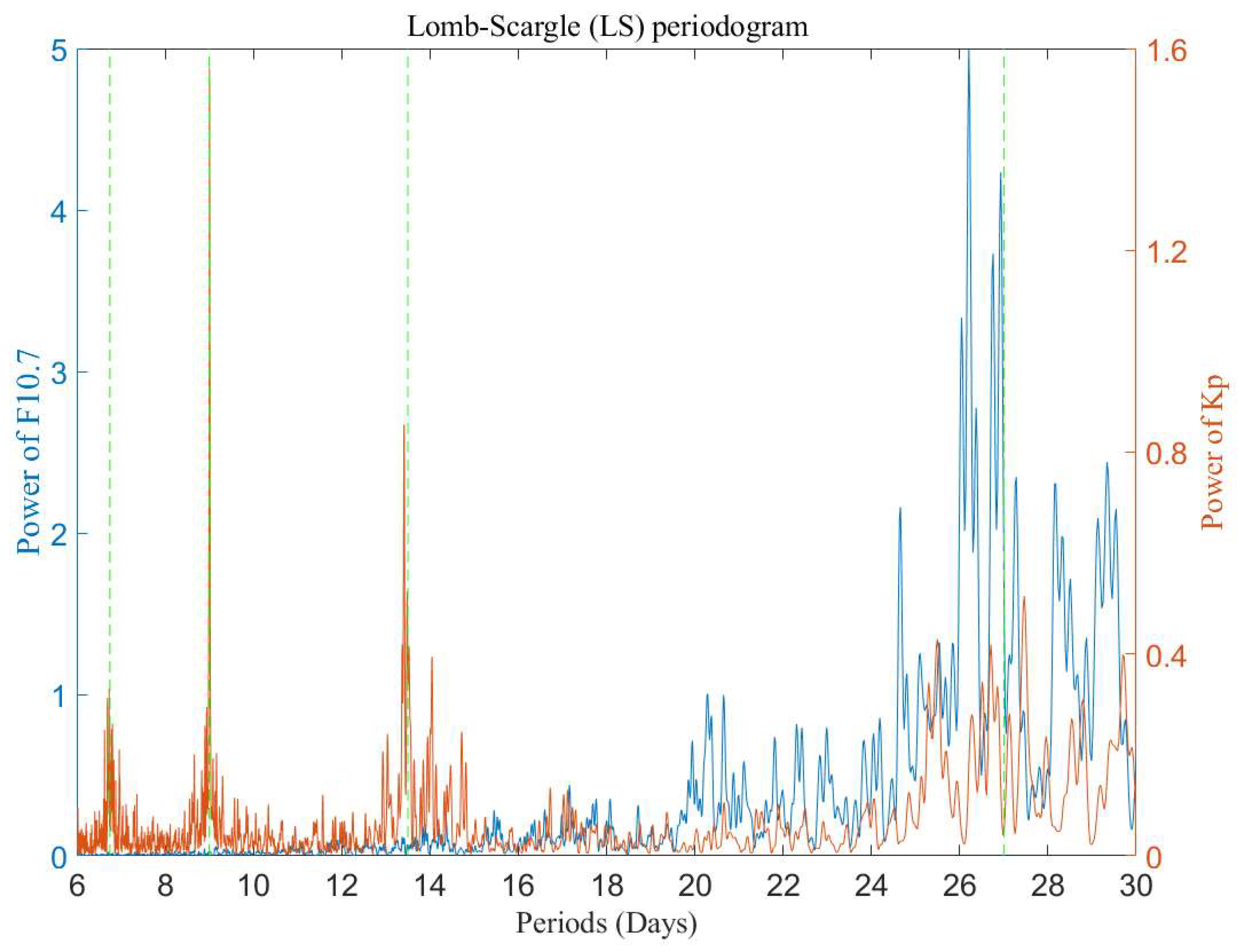 - Bartels, J. Twenty-seven day recurrences in terrestrial-magnetic and solar activity, 1923–1933. J. Geophys. Res. 1934, 39, 201. [Google Scholar] [CrossRef]