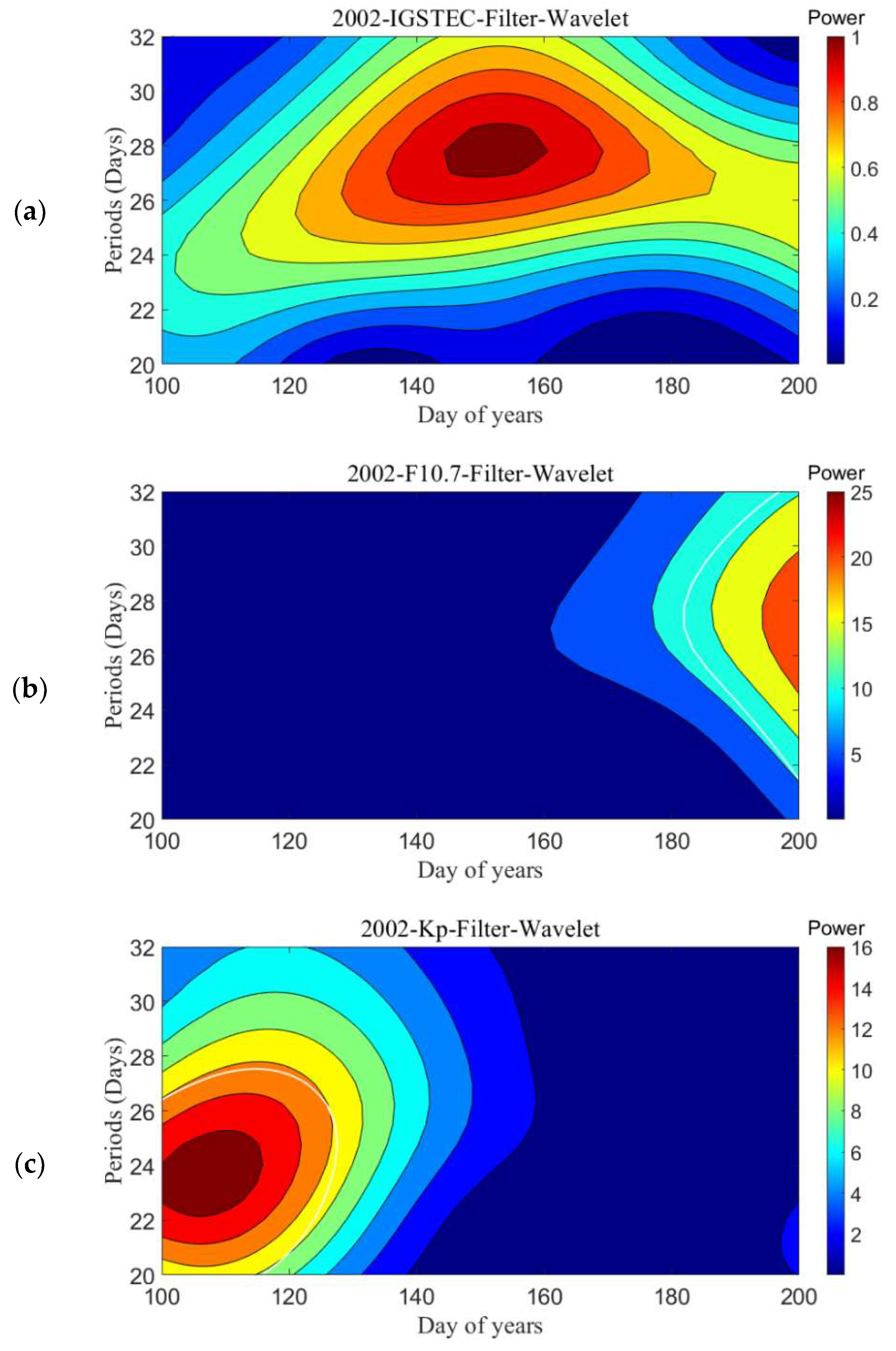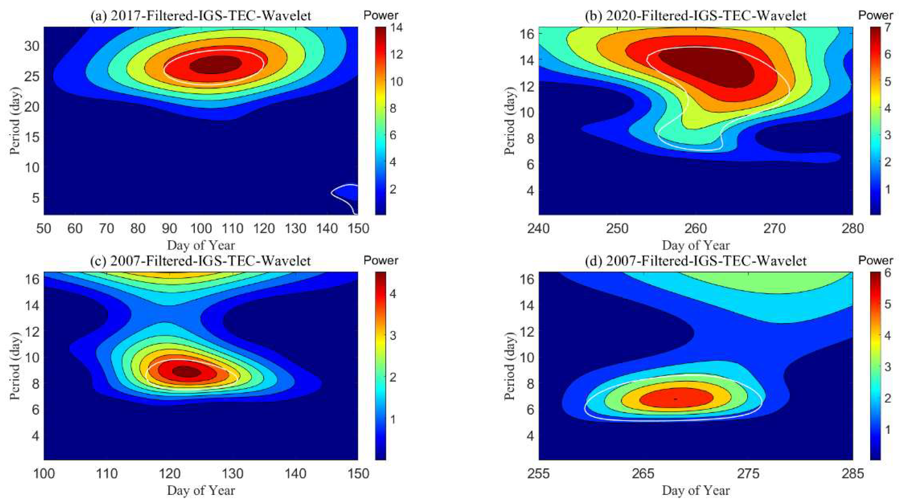 - The spectral peak with periods of 27 days in TEC over the Wuhan area corresponds to the periodic variations of the F10.7 and Kp index of the corresponding periods. However, the spectral peak with periods shorter than 20 days in TEC over the Wuhan area did not have dominating spectral peaks. The mid-latitude ionosphere exhibits unique regional properties, which did not respond well to the Kp oscillation with periods shorter than 20 days.